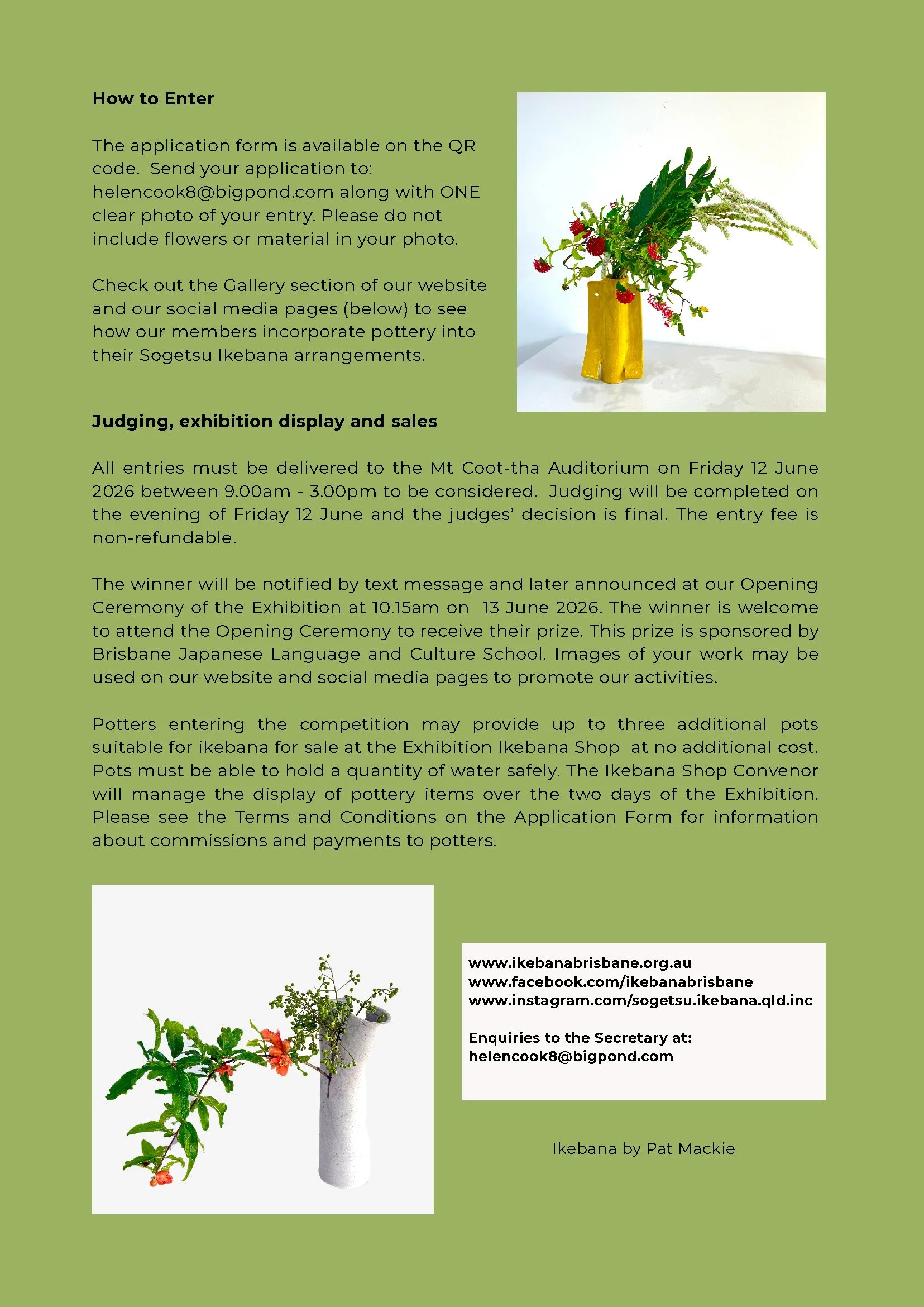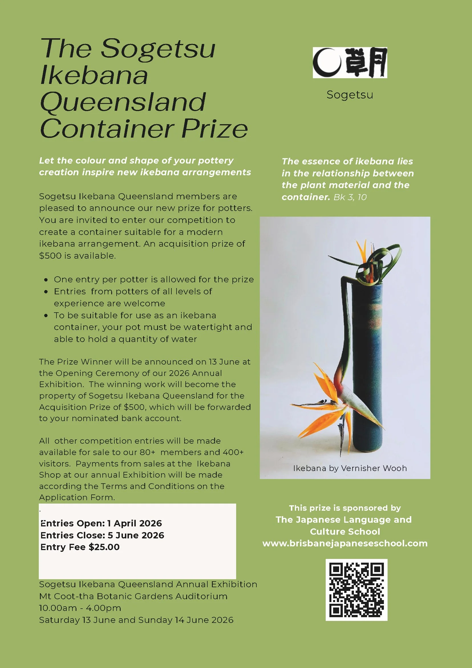 I am writing to invite your members to enter the new Sogetsu Ikebana Queensland Pottery Competition in June 2026. We are seeking entries from potters who might design pottery vases and containers suitable for Ikebana flower arrangements.